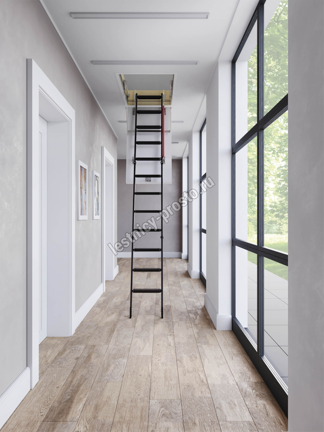 Лестница обладает повышенной теплоизоляцией и низкими показателями воздухопроницаемости крышки. Облегченная крышка люка изготовлена из пенополистирола без применения дополнительных деревянных элементов. Наконечники имеют возможность регулировки, что позволяет подогнать длину лестницы по высоте помещения в случае излишнего подрезания лестницы или изменения толщины пола.