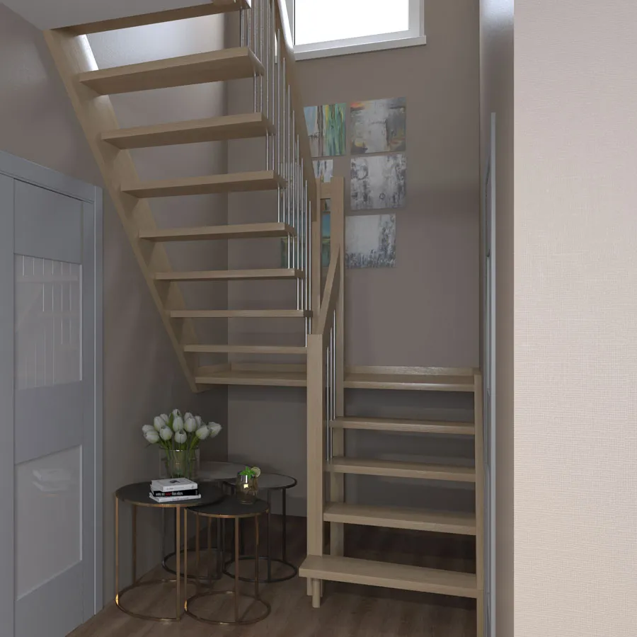 Базовый комплект включает в себя деревянные элементы лестницы и поручень без какого-либо покрытия.