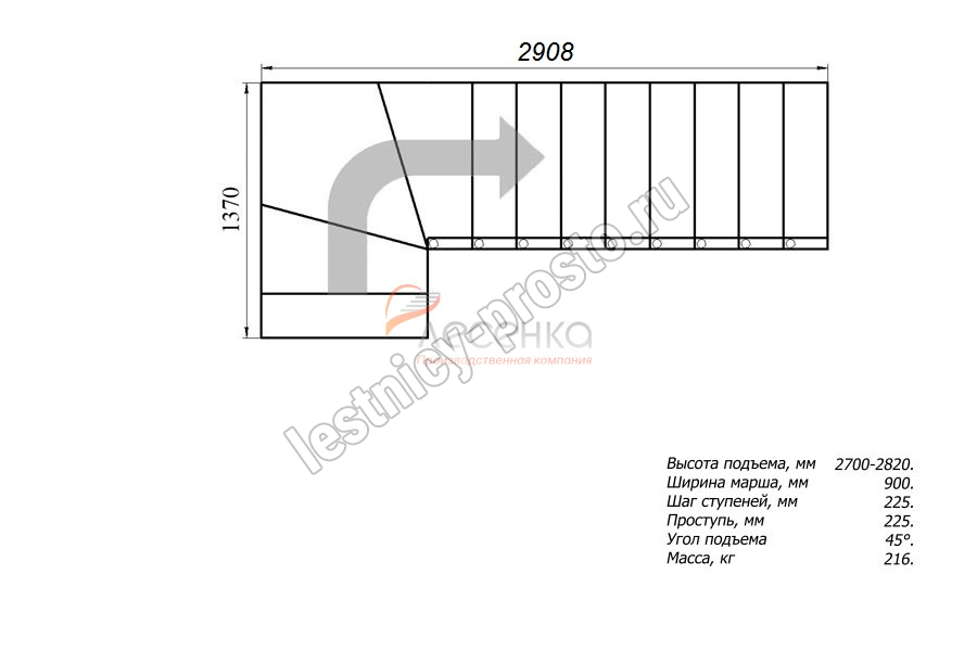 Модульная лестница Фаворит 225 2700-2820, Серый, Лиственница, Крашеная