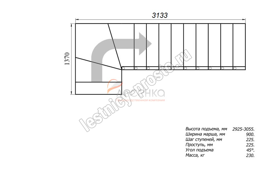 Модульная лестница Фаворит 225 2925-3055, Серый, Лиственница, Крашеная